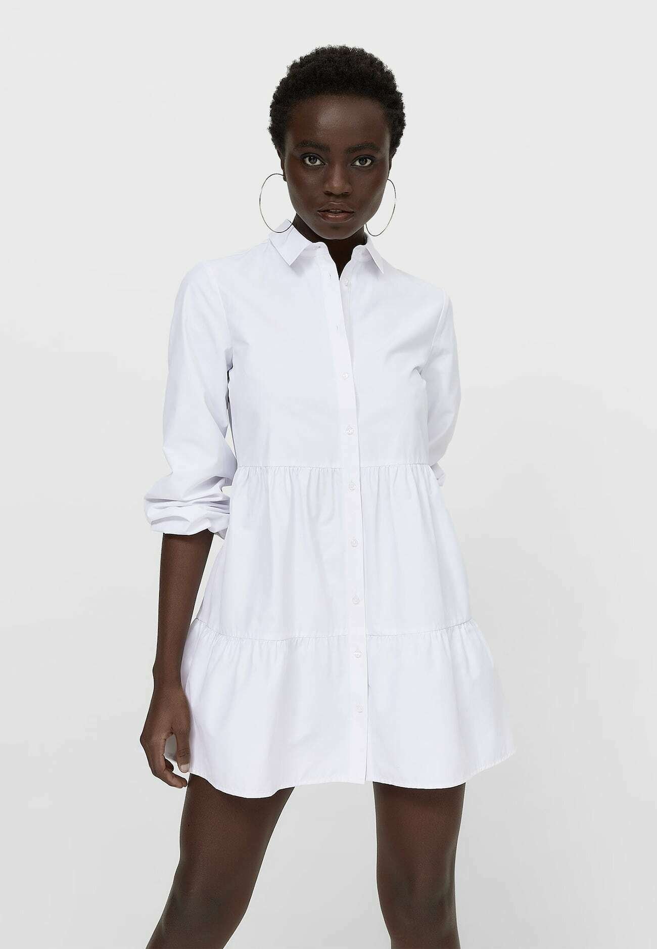 Popelin dress. Womens 34 Sleeve Basic Button Down Shirt Slim Fit Cotton Dress Shirts. Rear opening with natural wood buttons. Decorative natural wood buttons on neckline.