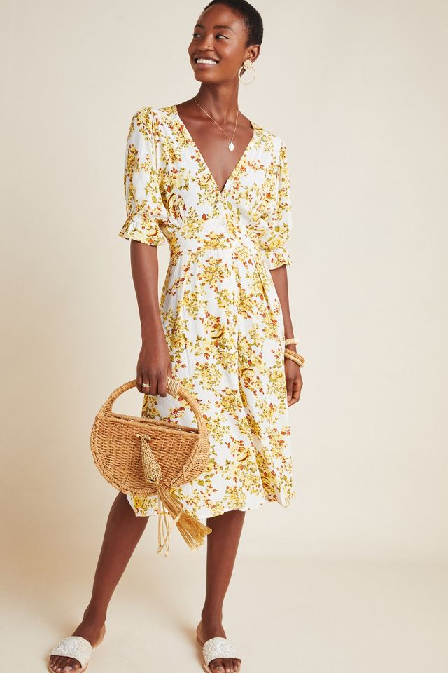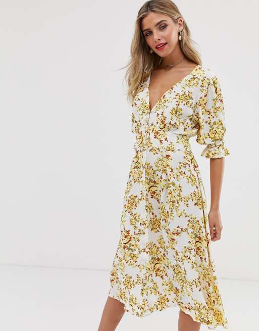 Beautiful dress that I actually wore once to a dinner party but left the tags on. It features a V neckline with invisible hook and eye pretty puffed sleeves and button front detailing on skirt with fixed back tie detailing designed to be tied to the back. Shop Womens Faithfull the Brand Green Yellow Size S Midi at a discounted price at Poshmark.